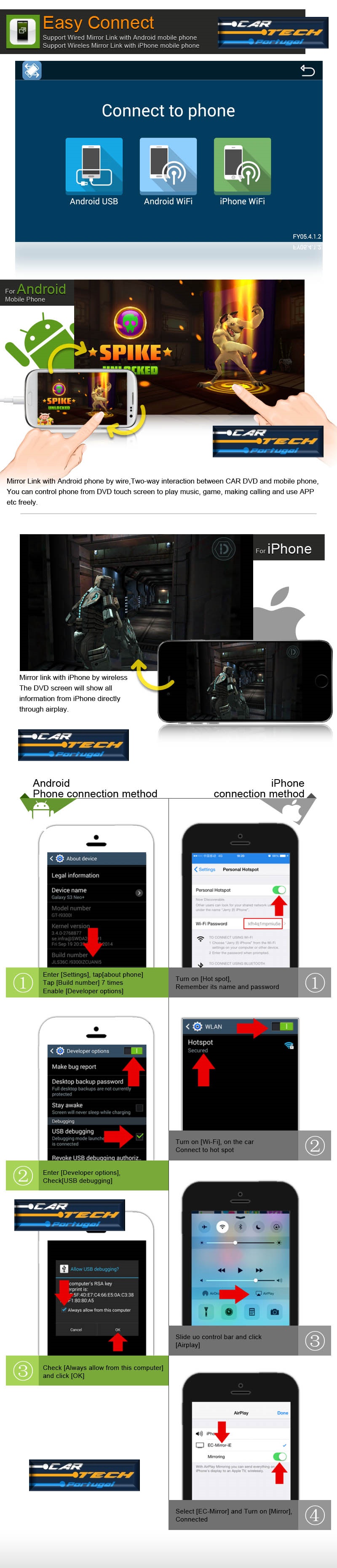 IPod / iPhone Função: Conecte seu iPhone ou iPod para o som do carro usando o cabo incluído e controlar todo o áudio da Apple através da tela sensível ao toque do receptortambém pode carregar o iPod / iPhone ..